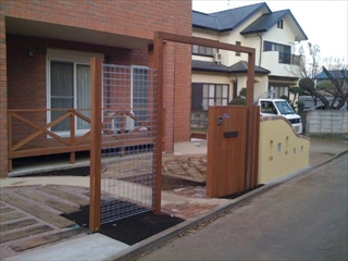 | 施工後 アイアンウッドのオリジナル門袖が完成。 手前のアイアンネットはモッコウバラを這わせる予定です。 |