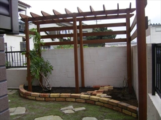 施工後 全体のトーンが暗かったのでブロック塀を明るい色の塗り壁に。 ウリン材のパーゴラも横に板を貼ってフェンスも兼ねてます。 屋外でも30~50年腐らない・アイアンウッドの紹介 アイアンウッドパーゴラ設置例一覧と他の施工事例 他の石積み・レンガ積み・ブロック積み施工事例 |