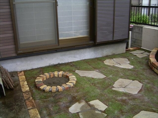 | 施工後 芝生の中には自然石のステップと猫ちゃんのプライベートスペースも設けました。 省管理型芝「TM9」詳細は→コチラ TM9の施工事例は→コチラ |