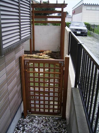 施工後 建物脇の通路からお庭に入るところには、同じウリン材で造ったオリジナル門扉を設置。 |