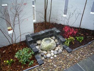 施工後 黒のピンコロ石でつくばいを囲み、砂利と土との土留めに瓦材を使い和モダンを演出しました。 土の部分は塗り壁へ土が飛散しないようにバークチップを敷きました。 つくばい・和風アイテムの他施工事例 |