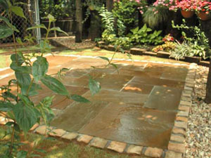 施工後 テラスの材質はタイルではなく自然石の方がナチュラルさが出ると思いそうしました。さらに同系色ピンコロで縁取りをして樹木の足元は化粧砂利に。 |
