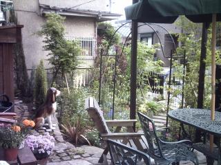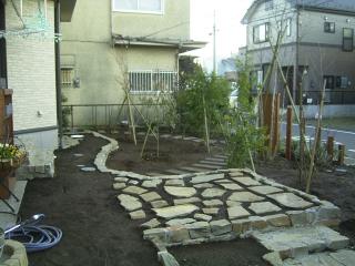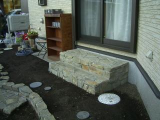 施工後 施工中一番苦労したのが左の写真にあるステップです。一般的な薄い石を表面に貼って いるのではなくランダムな石を組み合わせて積んで仕上げました。 |