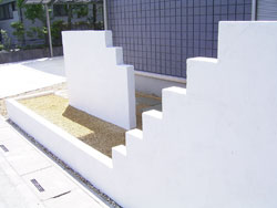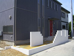 | 施工後 建物の外壁がスクエアのパターンの繰り返しだったのでそのイメージを門袖にも出そうと階段状にしてスクエアを強調しました。また、壁を前後にずらすことで圧迫感を軽くしています。 |