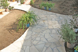 | 施工後 門周りがどっしりしているので、玄関までのアプローチは曲線で柔らかさを出すと同時に自然石の乱張りで高級感も出しました。 |