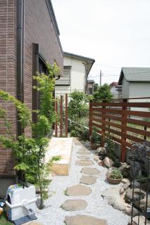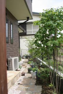 施工後 洋風ゾーンは自然石の通路の両脇に植物を配し、雑木林の中を歩いている感じに仕上げました。 右:コハウチワカエデ 奥:エゴノキ など |