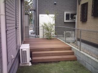 お庭を有効利用したアイアンウッドデッキ施工後 デッキのステップ部分の蹴上高は、お子様にも軽々上がれる12cm。 |