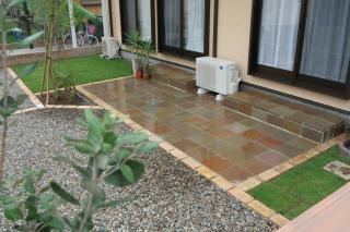 施工後 テラスには砂岩系の方形石平板を使い、自然の風合いをかもし出してくれます。縁取りレンガはアンティークの耐火レンガを使用。 方形石平板と耐火煉瓦との組み合わせがいい感じですね。 他のテラス施工事例紹介はこちら |