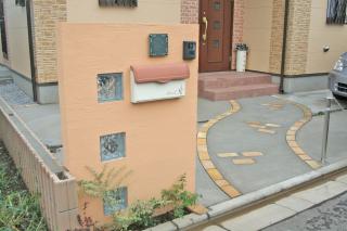 | 施工後 門柱は塗り壁をご提案。 ラフなボーダーラインの塗り壁、ディーズポスト(スタッコーU)、表札、カットの入ったガラスブロックの微妙な色合いがあいまったお施主様オンリーワンの門柱に仕上がりました。 他のポスト設置事例のご紹介はこちら 他の表札設置事例のご紹介はこちら |