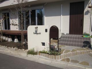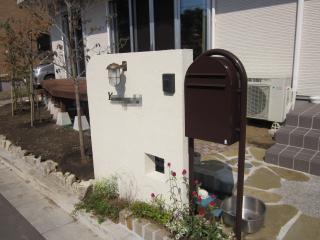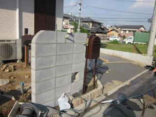 | 施工中の様子 門袖も積みあがり、ジョリパット(塗り壁)で仕上げた後、表札とライトとインターホンが付きます。 隣にあるのはオシャレなポストです。 |