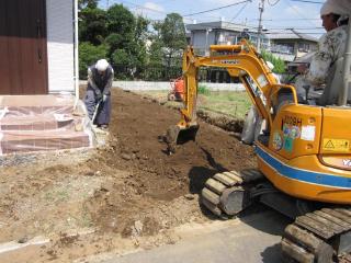 施工中の様子 まずは駐車場の高さを決めてから、ユンボを使って土のすきとりを行いました。 |