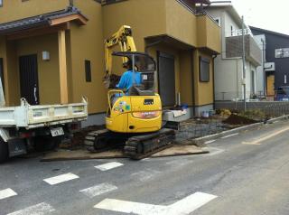 ![]() まずは、駐車場となる部分の高さを決め、余分な土を機械を使って馴らし取っている様子です。 |
