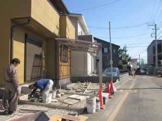 ![]() 下地コンクリートを打ちその日のうちに石貼りも終了。敷地に合わせて石を電動工具で切り貼り合わせ完了です。この石は自然石で非常に硬いのでカットに時間が掛かるのです。 |