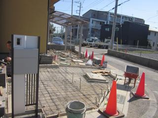 ![]() 石貼りの奥は土間コンクリート仕上げです。刷毛引き仕上げです。土間の勾配が急な為、滑りやすいので仕上げに刷毛で馴らしザラザラにして滑りにくくしました。 |