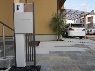 ![]() こちらは玄関ポーチの前に立てたLIXILファンクションユニット・ウェルモダン、表札・インターホン・照明が付き機能的です。床には自然石を敷きます。 |