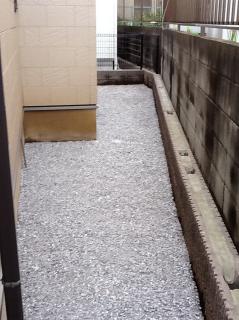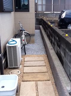 ![]() 家と隣地のスペース。アプローチに敷いてあった敷石とサビ砂利を流用し施工いたしました。ちょっと和モダン風になりました。 |