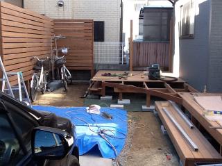 ウッドフェンスが半分位終わったところです。目線の遮りですので横板の隙間は2cmにしました。ウッドデッキも3割程の完成です。後、2日位で全部完成いたします。