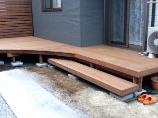 掃き出し窓からあまり段差のないようにデッキ床面の高さを工夫いたしました。ステップはどこでも降りれるようにひな壇タイプをオススメいたしました。
