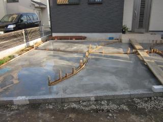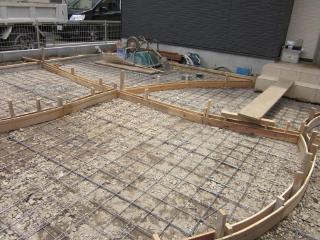 ![]() 施工中 駐車場&アプローチのアクセントにR型の草目地にし、後はコンクリートを流し入れるだけです。 |