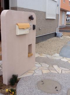 ![]() 門柱は、丸みを付けた可愛らしい色のジョリパット仕上げにしました。ポストはディーズガーデンのクレアーUのイエロー、表札灯はLEDのリーフ型にしたところ可愛さが増しました。四角い小窓をくり抜き小花置くスペースも可愛いですね。 |