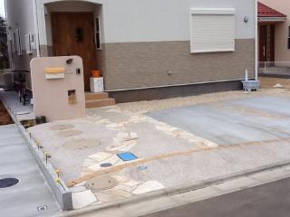 ![]() アプローチを兼ねた駐車場の床面は主に乱形石貼りとФ6mmの化粧砂利を使用した洗い出し舗装で仕上げました。 |