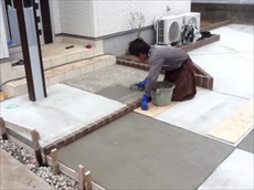 玄関アプローチの洗い出し舗装の施工中です。化粧玉砂利とセメントを混ぜ、一度コテで平滑に均し、表面のセメントを洗い出し化粧砂利を浮き出させます。