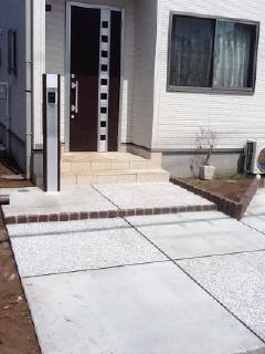 完成しました。シンプルモダンに合わせたアプローチと駐車場です。色合いは外壁と玄関ドアを基調にいたしました。