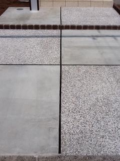 すっきりとしたアプローチのデザインですが、床面に洗い出し舗装とコンクリートの金コテ仕上げを市松に施しました。
