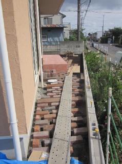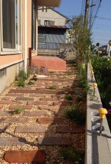![]() アンティークレンガが敷き終わったところです。この後、レンガとレンガの間に植栽をします。 |