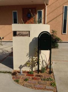 ![]() 門袖を曲線に仕上げ、裏側にはオリーブを植栽しました。アプローチはアンティークレンガをランダムに配し、その間にタイム、グレゴマ、リシマキア等の矮性植物を植栽しました。ポストは、BOBI社のBONBOBI前入れ後ろ出しタイプを設置、お色はお施主様と意見が合い、ダークグリーンで決まりました。バッチリです。 |