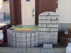 ![]() 施工前 玄関前の既存ブロックを解体撤去して新たに曲線の花壇と門袖を作成します。 |