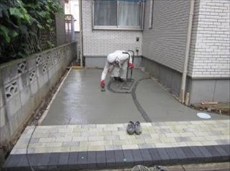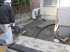 ![]() 2日目にインターロッキング(舗装用コンクリートブロックの一種)を敷きました。3色をお施主様の好みのパターンで配列し、マス回りも綺麗に加工できました |