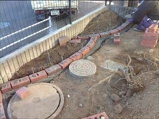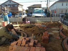 ![]() 庭にはレンガで花壇を新しく造ります。ベース基礎が出来レンガを4段積みます。奥様がお花が好きで季節の草花を植えられる花壇です。 |