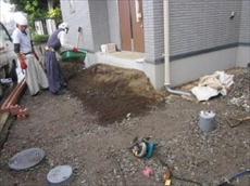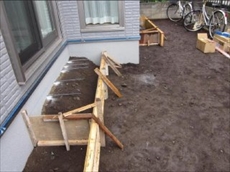 ![]() 門袖には、伸縮門扉(カーゲート)と親子門扉の柱を立てて固定しました。翌日は土間コンクリートを打ちます。 |