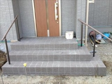 ![]() 続いて、玄関ポーチの階段のタイルを貼り、手摺を付け終わりました。 |