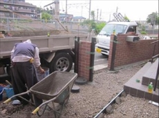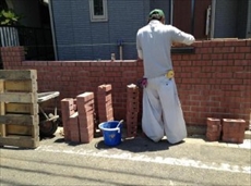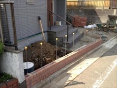 ![]() 門袖はレンガで積み上げますので、基礎を作り鉄筋を配置し積んでいる最中です。 |