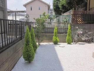 ![]() お庭にはゴールドクレストとソヨゴを植えました。床は防草シートと白砂利で防草対策をしています。 |