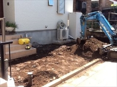 ![]() まずは既存の土を重機で堀り、駐車場の路盤を作ります。砕石路盤とコンクリートの厚さを考え約20cm掘り路床を作ります。残土はダンプで処分場へ運搬いたします。 |