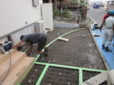 ![]() 駐車場コンクリートの打設状況です。公共道路を汚さないようシート養生し、お家の壁、タイルなども汚さないように一輪車で運搬をして、コンクリートを金コテで平らに均していきます。 |