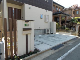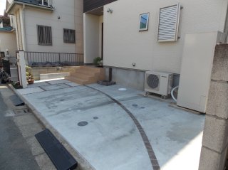 ![]() 駐車場側から見た様子です。土間コンクリートに、ごげ茶色のキューブレンガを使って縁取りを施し変化を付けました。 |