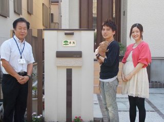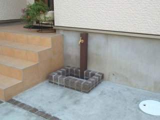 ![]() 駐車場にあった立水栓をおしゃれに演出いたしました。水栓柱は木目調のラッピングをした素材をご提案。日本興業の製品です。パン(流し台)はオリジナルで手作りしてみました。駐車場やアプローチと同じこげ茶色のキューブレンガを使って、お揃いのデザインにしました。 |