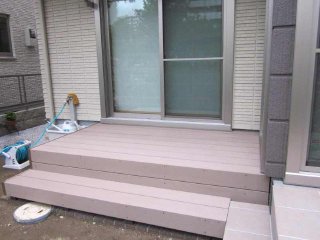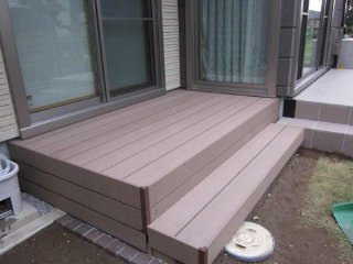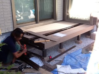 ![]() 人工木デッキの製作中です。製品は今年新発売されたLIXILの樹ら楽(きらら)シリーズです。表面温度が熱くなりにくい加工がしてあります。リアルな木質感に特徴があります。画像の通り大引きはしっかしりたアルミ材、腐る心配がありません。お施主様の一言「随分しっかりしてますね」。 |