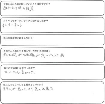| T様 今回は施工させてくださりありがとうございました。 またこれからも宜しくお願いいたします。 |