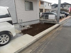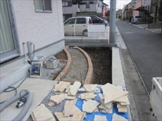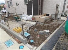 ![]() お庭部分は必要のない砂利を撤去して路盤づくりです。この後はレンガと乱形石を貼っていき、化粧ブロックとフェンスで道路との区切りを付けていきます。 |