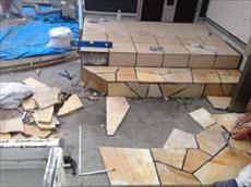 ![]() 玄関前の階段を新しく造り直して、乱形石(イエロー)を貼っています。自然石なので、加工しないで使える石や加工しないと合わない石など様々な形が組み合わさります。 |