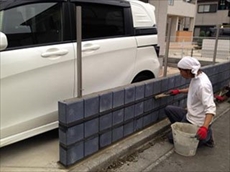 ![]() お庭部分は石貼りも終えて化粧ブロック(町田コーポレーション、アイロックのブラック)を積み上げて、目地を1段ずつ掃除しているところです。掃除を怠ると目地以外でモルタルが白くなり汚れます。 |