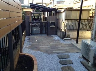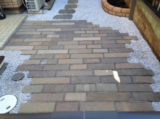 化粧ブロックの門袖と、ランダム石貼りのアプローチ所沢市K様邸 施工費用:146万円 工期:10日間 門袖は化粧ブロックを積み上げて作り、口金のポストを取り付けました。アプローチの石貼りは、3つのサイズをランダムに貼り合わせて仕上げました。お庭の境界側には目隠しフェンスを取り付けました。 |