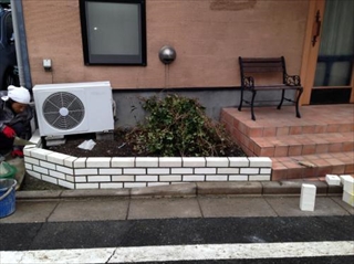 今回はお庭設置したウッドデッキが深刻な白アリの被害に遭っているため解体し、レンガと石貼りとウッドデッキを構成して作っていきます。白アリに関しては、業者さんに依頼して建物に薬を注入してもらったそうです。 |