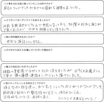 ![]() ウッドデッキが完成しました。ウッドにはイペ材を使用しました。 |