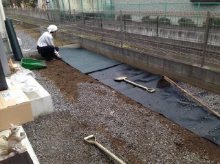![]() まずはデッキの下にも防草シートと砂利を敷き、防草対策をしました。 |